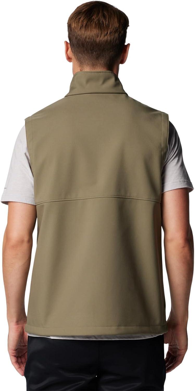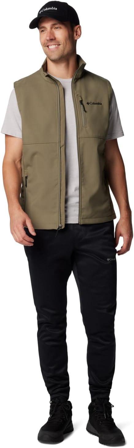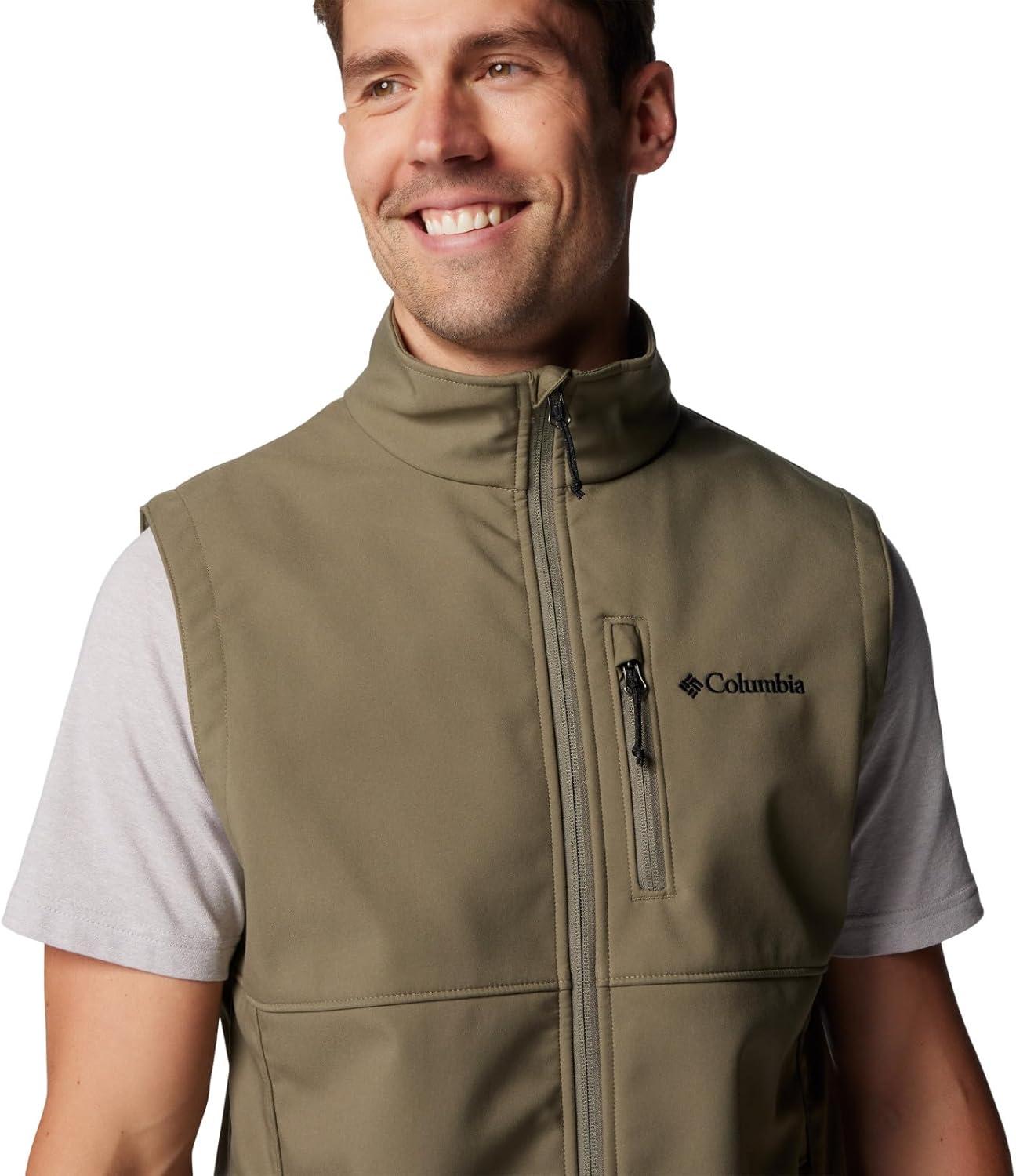 A performance layer for in-between temperatures, this Columbia men’s softshell vest has advanced repellency to fend off rain, stains, and wind. Columbia offers this vest in multiple colors and sizes. Extended and tall sizing available. Regular fit.