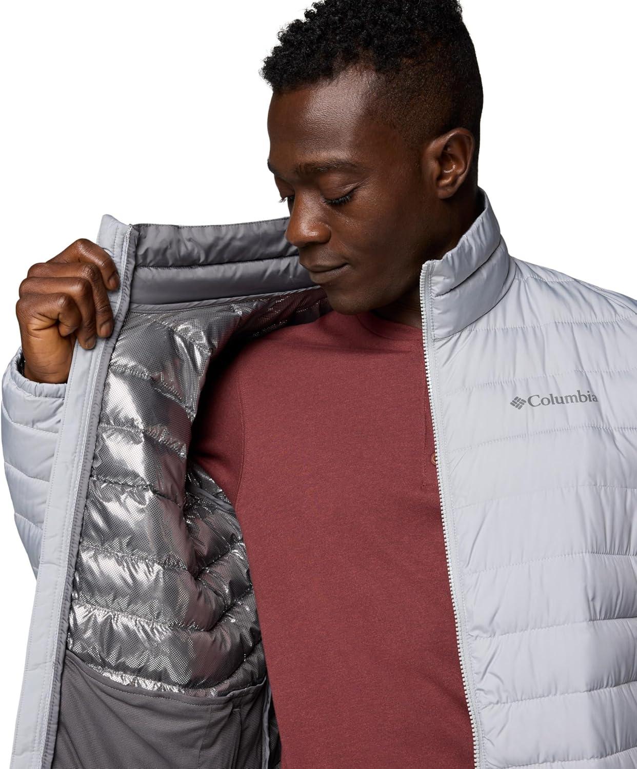 Highly versatile, lightweight, and warm, this Columbia men’s jacket offers rain-and-stain repellency plus a thermal-reflective lining to keep you protected in light rain or snowfall. It's packed with recycled synthetic insulation. Columbia offers this jacket in multiple colors and sizes. Extended and tall sizing available. Active fit.