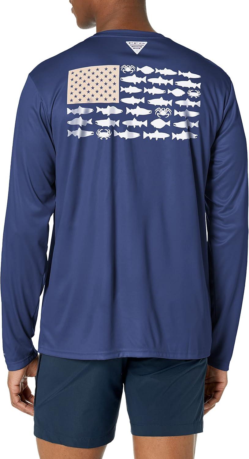 Columbia Men’s Terminal Tackle PFG Fish Flag Long Sleeve Shirt Discontinued(Cypress/Opal Blue Bass Lures)
