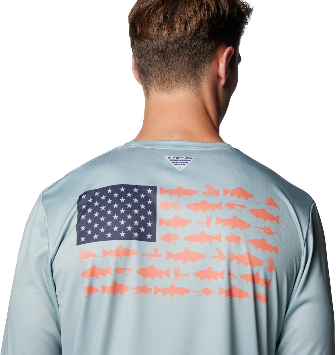 imageColumbia Mens Terminal Tackle PFG Fish Flag Long Sleeve Shirt DiscontinuedCrushed BlueFaded Peach Trout  Flies